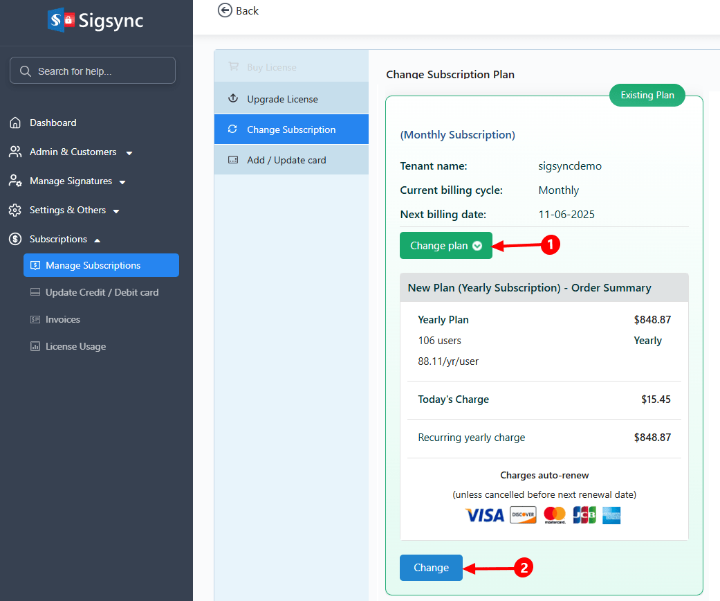 - You can change the subscription plan from monthly to yearly or yearly to monthly. In the Order Summary, you will be shown the difference amount based on the prorated billing to be paid now (if any) under Today's Charge and the next billing cost under the Recurring yearly charge section. Click on the Change Plan button as shown to confirm the changes.