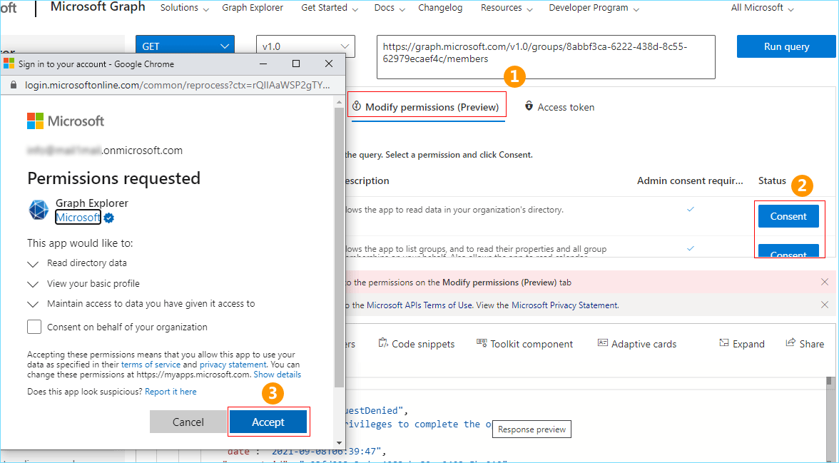- If it prompts the error: Forbidden – 403, then you need to consent to the permissions on the Modify permissions (Preview) tab. Now, click on the Modify permissions (Preview) tab as shown in the screenshot. Click the Consent button and then Accept in the pop-up window that appears. Repeat the same procedure for all the listed permissions. Once it is done, enter your query again and click the Run query button.