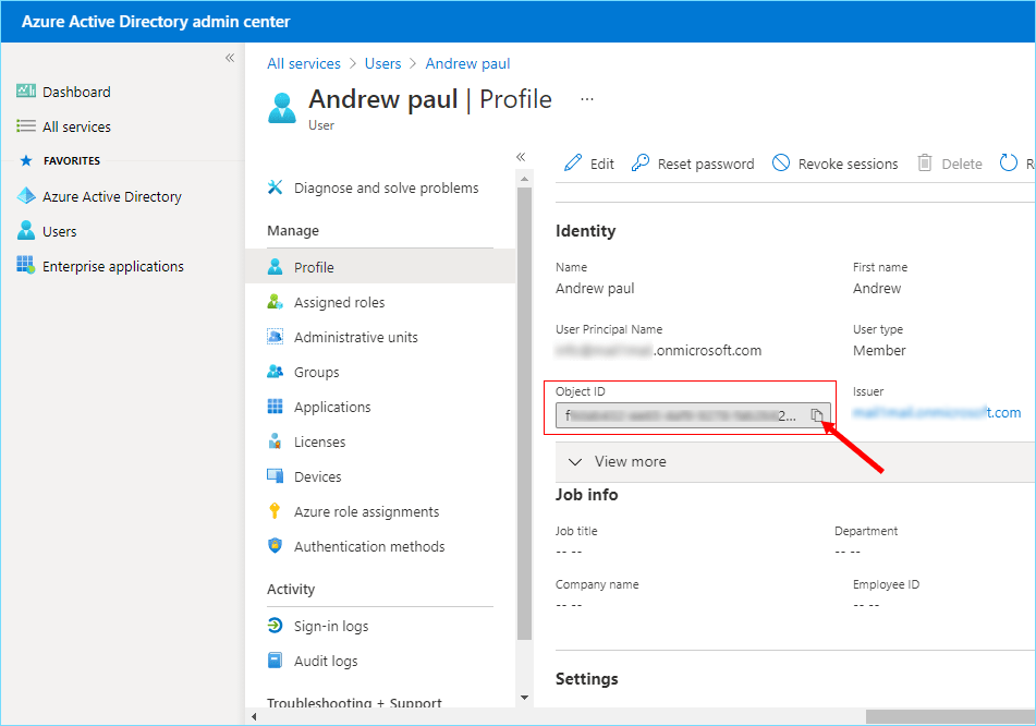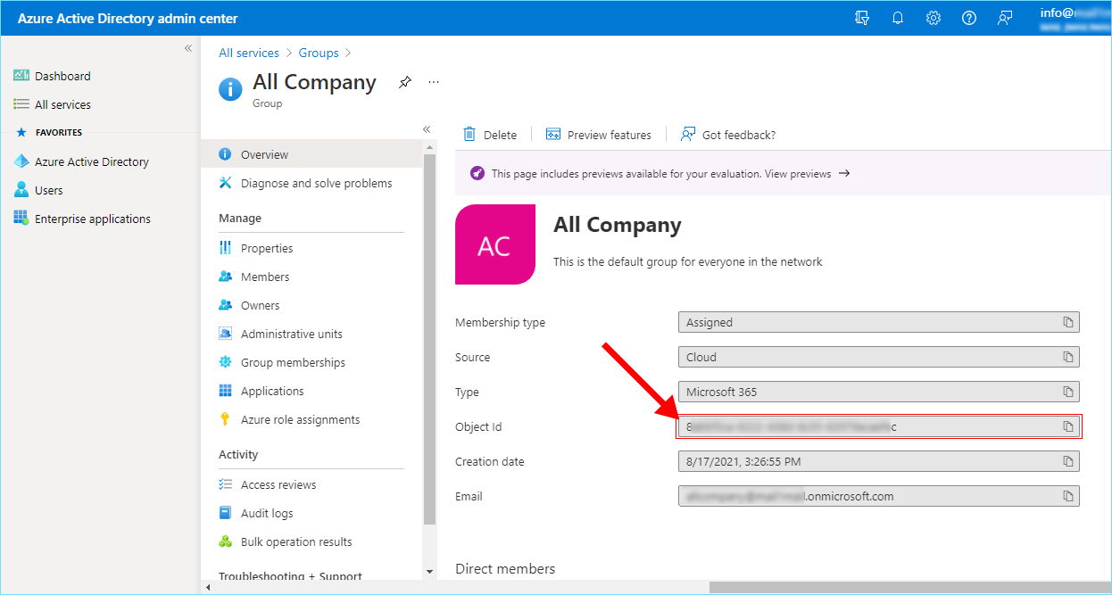- Click the group that consists of newly added users. Click the copy button next to the Object Id as shown, to copy the Object ID value under the Overview settings page