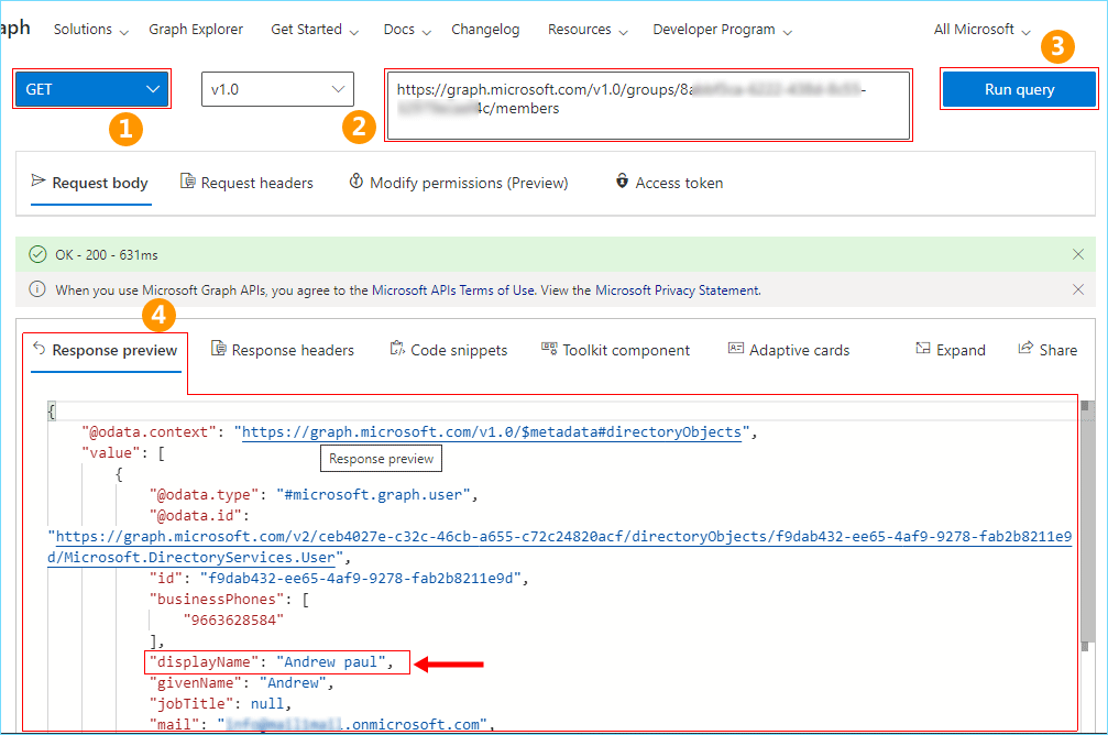 - Select GET from the drop-down menu on top of the window as shown. Enter https://graph.microsoft.com/v1.0/groups/{ID}/members in the URL field where {ID} is the group’s Object ID value as you’ve previously copied in Step 3. Now click the Run query button in the top right corner of the window.