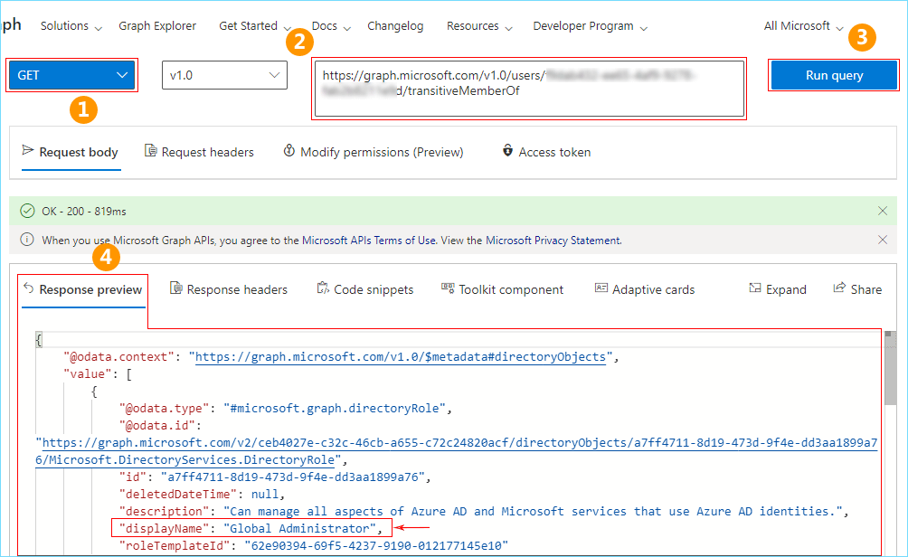 - Select GET from the drop-down menu at the left side, top of the window. Enter https://graph.microsoft.com/v1.0/users/ {ID}/transitiveMemberOf in the URL field where {ID} is the user’s Object ID value as you’ve copied in Step 4 of this method. Now click the Run query button in the top right corner of the window.