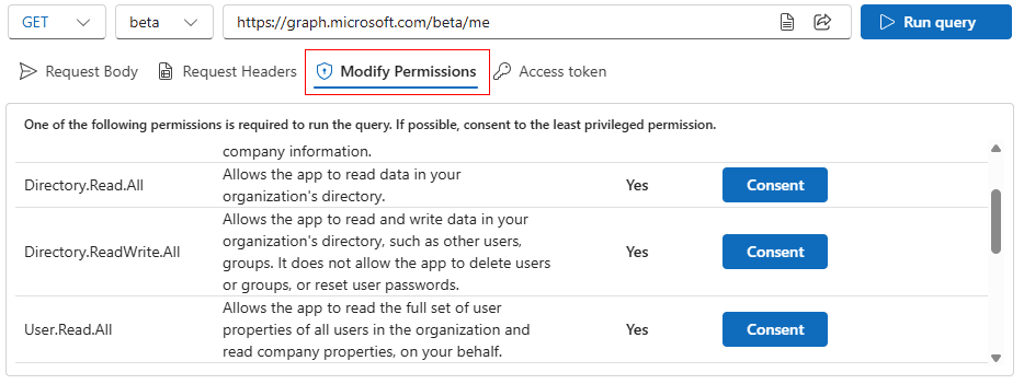 - Click on the Consent button in the Modify permissions (Preview) tab to provide the permission as per your requirement.