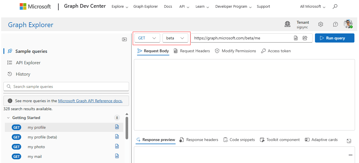 - In the top, select the query operator as GET and API version as beta from the dropdown as shown.