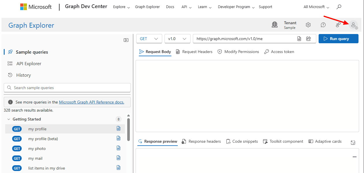 - Visit https://developer.microsoft.com/en-us/graph/graph-explorer site and login with the global admin account.