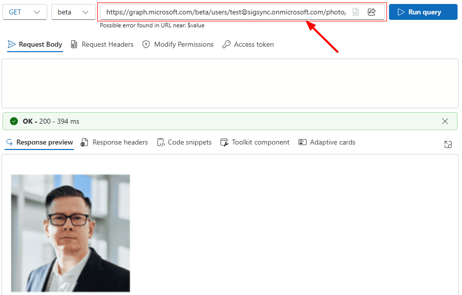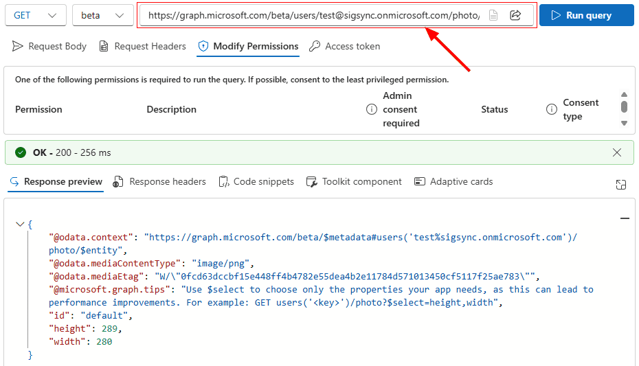 Enter the below URL in the query box to verify the information of the User profile photo as this is missing in the above result.