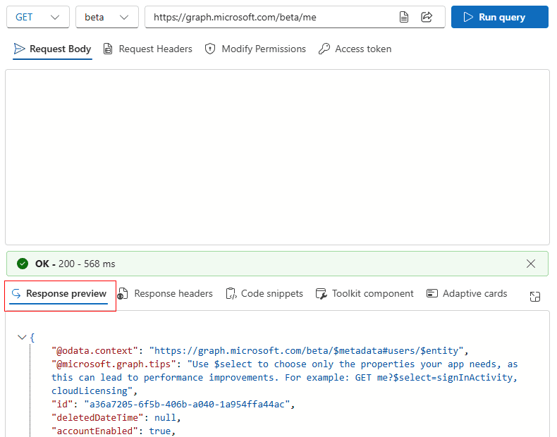 In the query box, type in the URL https://graph.microsoft.com/beta/me and click on the Run query button to view the Azure AD values under the Response preview tab as shown.