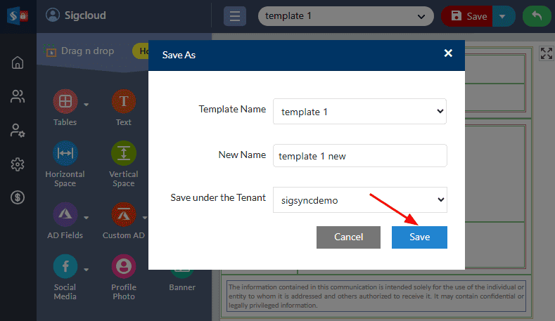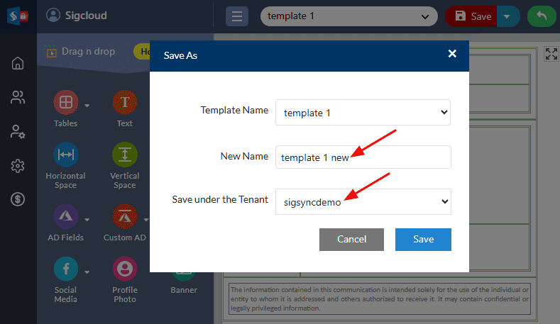 - Enter the new name for the template and select the tenant under which you want to save.