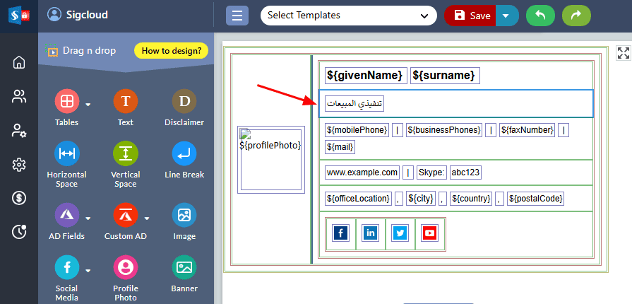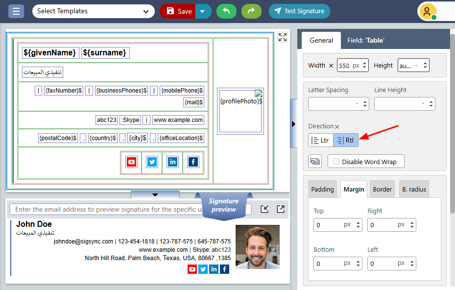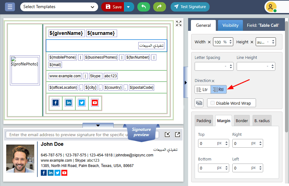 Sigsync Office 365 Email Signature Editor allows you to adjust the text direction for either a specific table cell or the entire signature template, providing full control over the layout of your signature. By using the Text Direction property in the right-hand side pane, you can switch between Left-to-Right (LTR) and Right-to-Left (RTL) text orientations. This feature is especially useful for creating professional-looking signatures in languages such as Hebrew or Arabic, ensuring proper alignment, readability, and a polished appearance in all emails.