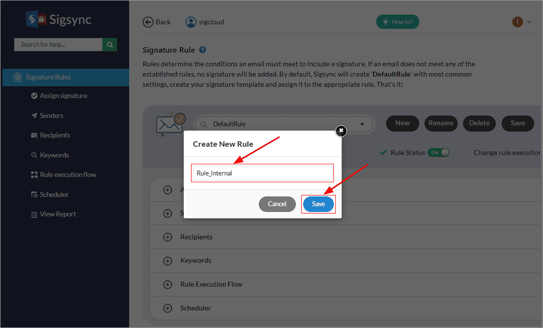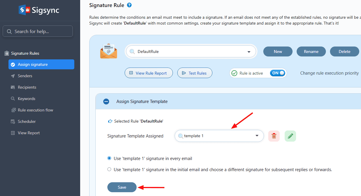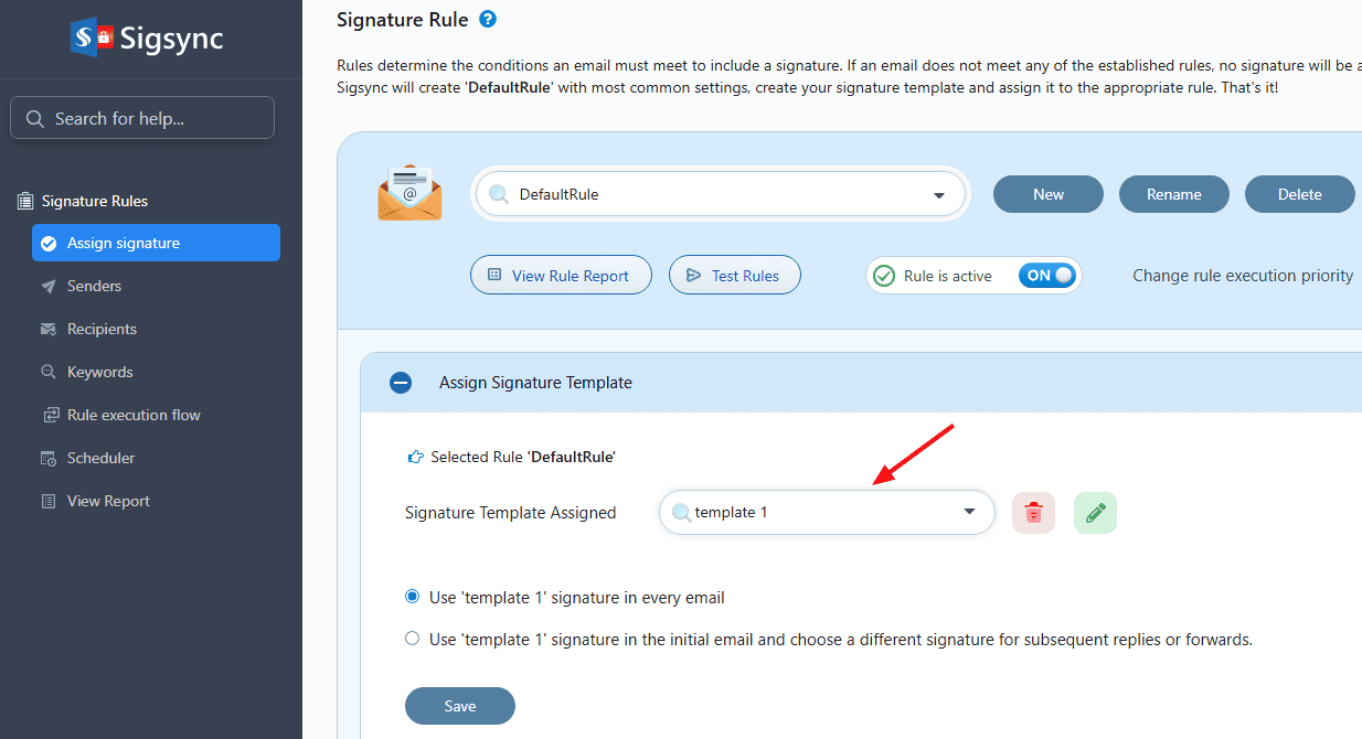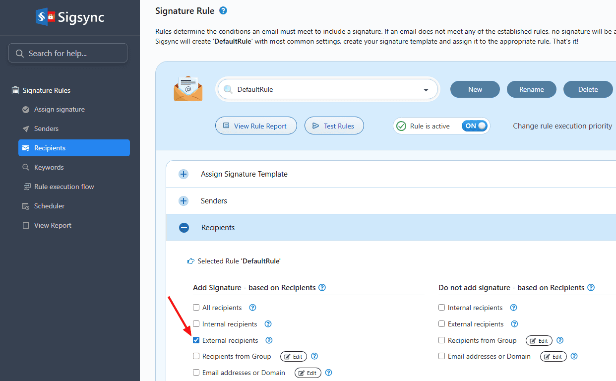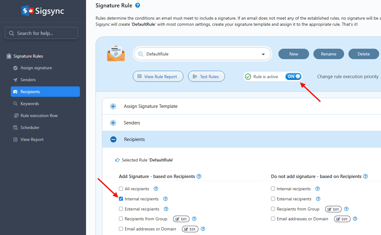 To set up different signatures for internal and external emails, create individual rules in Sigsync. Set the appropriate ‘Recipients’ conditions and assign the respective signature templates.