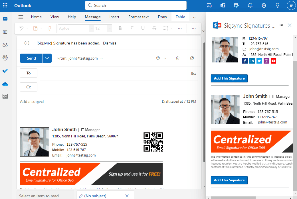 You can deploy the Sigsync Signature Add-in directly in Outlook for Windows, Outlook Web Application (OWA), or through the Microsoft 365 admin center. This Add-in enables centralized management of email signatures for your Office 365 users at the client side. By configuring rules, signature templates, and settings in the Sigsync service, you can insert signatures directly into emails as you compose them in Outlook.