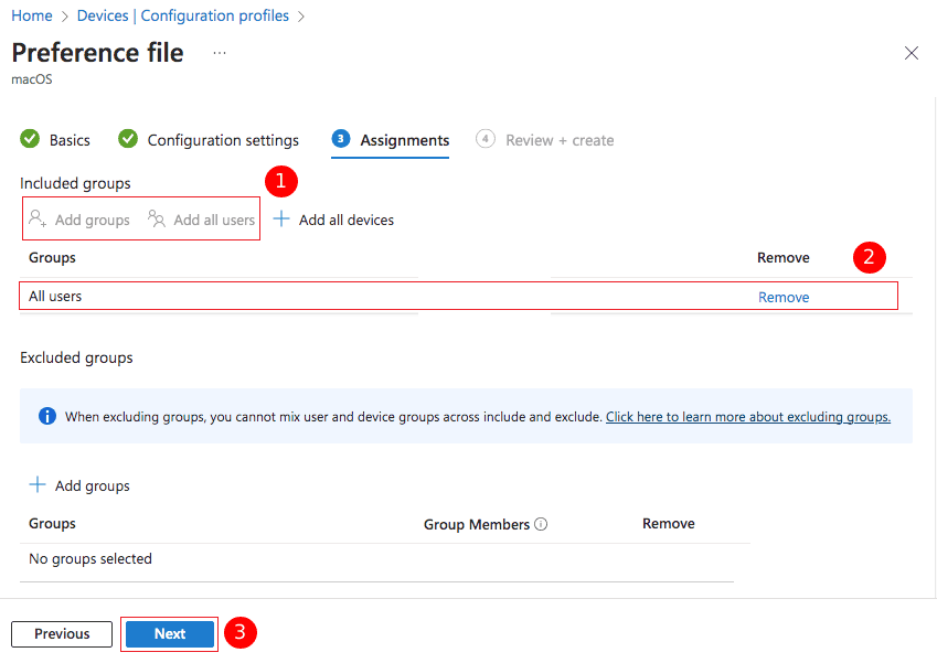 In case you prefer to enable users from specific Azure Active Directory (AAD) groups to utilize the native signature experience in Outlook for Mac, you have the option to exclude them from this policy. To exclude these users, navigate to the ‘Excluded groups’ section and click on ‘Add groups’.