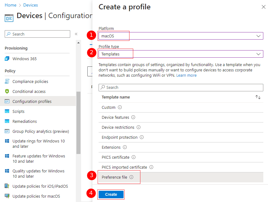- Select ‘macOS’ under ‘Platform’ and ‘Templates’ under ‘Profile type’ dropdown lists. Then , choose ‘ Preference file’ under Template name, and click the ‘Create’ button for the new configuration profile creation.