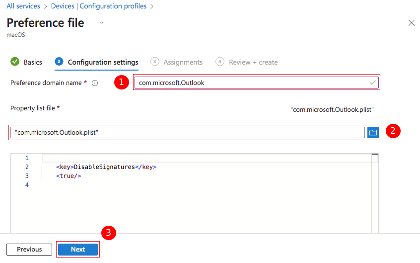 To deactivate the built-in email signature functionality in Outlook for Mac, you must initially generate a .plist file with the necessary settings. Afterwards, you will employ this file within Microsoft Intune while setting up a configuration profile. Follow the steps below to proceed: