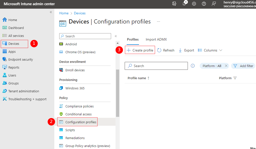 - Navigate to the ‘Devices’ > ‘Configuration profiles’ and click the Create profile’ button