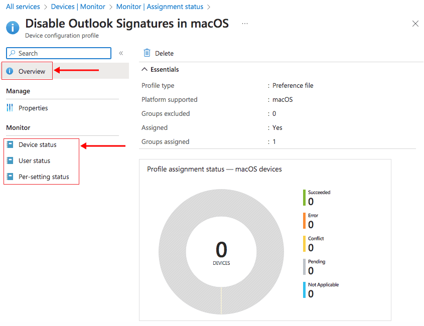 On the ‘Overview’ page, you can review the assignment status of the configuration profile, including the number of devices and users that it was successfully or unsuccessfully assigned to. For more detailed information on specific aspects such as devices, users, or individual settings, you can click on the corresponding options: ‘Device status’, ‘User status’, or ‘Per-setting status’.