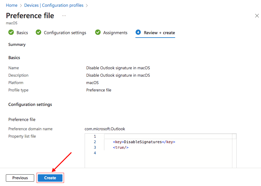 - In the final step, ‘Review + create’, you can ensure that all the settings are correct before finalizing. If everything looks good, click on the ‘Create’ button to save and apply your policy. From this point onward, the native signature experience in Outlook for Mac will be disabled on all or selected users computers according to your policy.Note: