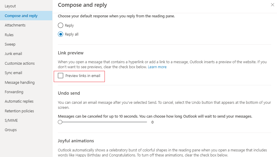 Steps for disabling link preview on Outlook.com and Outlook on the web (OWA)