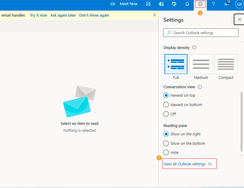 - At the top of the page, select Settings -> View all Outlook settings.