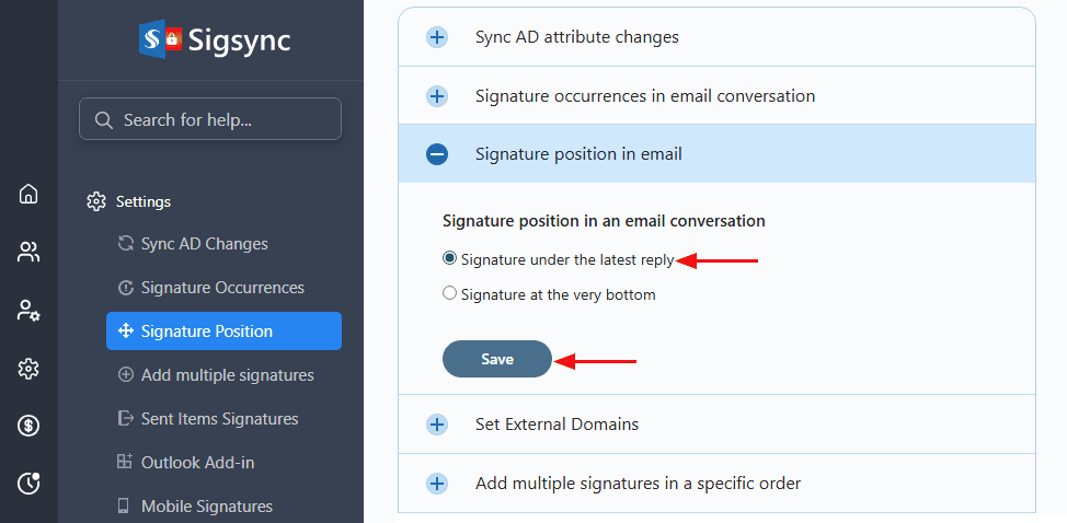 This option in Sigsync 'Settings' allows you to specify the location of the signature to be appended in the chain of emails which are reply or forward emails containing previous email conversations.