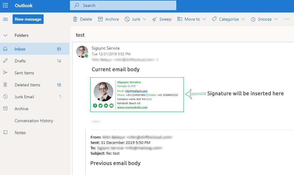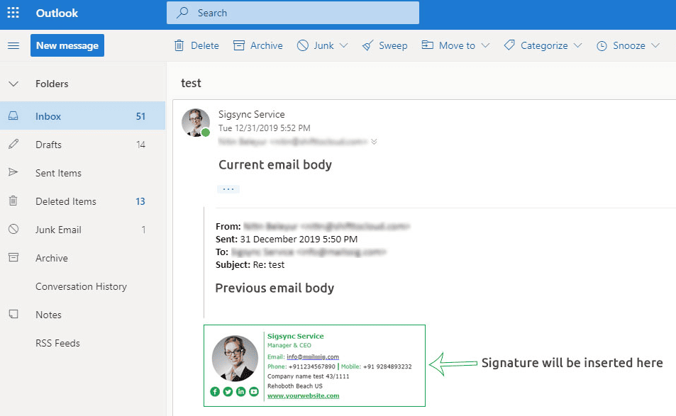 Signature at the very bottom – Choose this option if you want the signature to appear after all the email body including previous email body as shown below. Click on the Save Changes button to save.