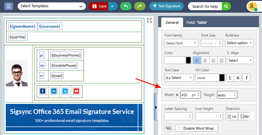 - Set the width of the table or image to a suitable value that ensures the signature displays correctly across devices.