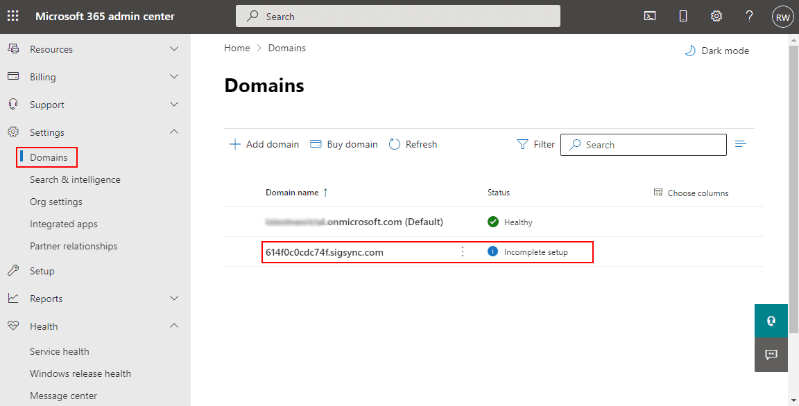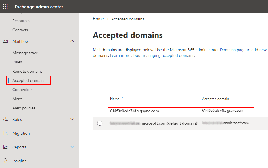 Steps to find the Sigsync domain name using Microsoft 365 admin center