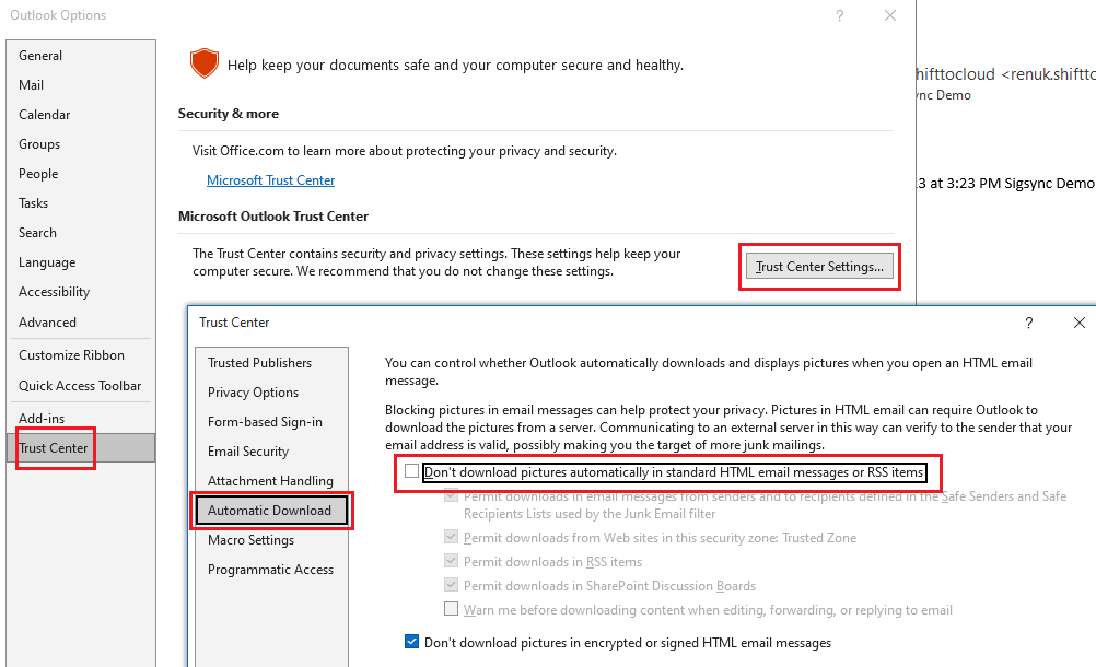 - Under the 'Microsoft Outlook Trust Center' section, clear the checkbox next to 'Don't download pictures automatically in HTML e-mail messages or RSS items'