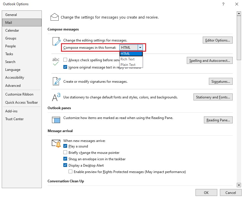 - Click on 'File', then select 'Options', followed by 'Mail' and 'Editor Options'.