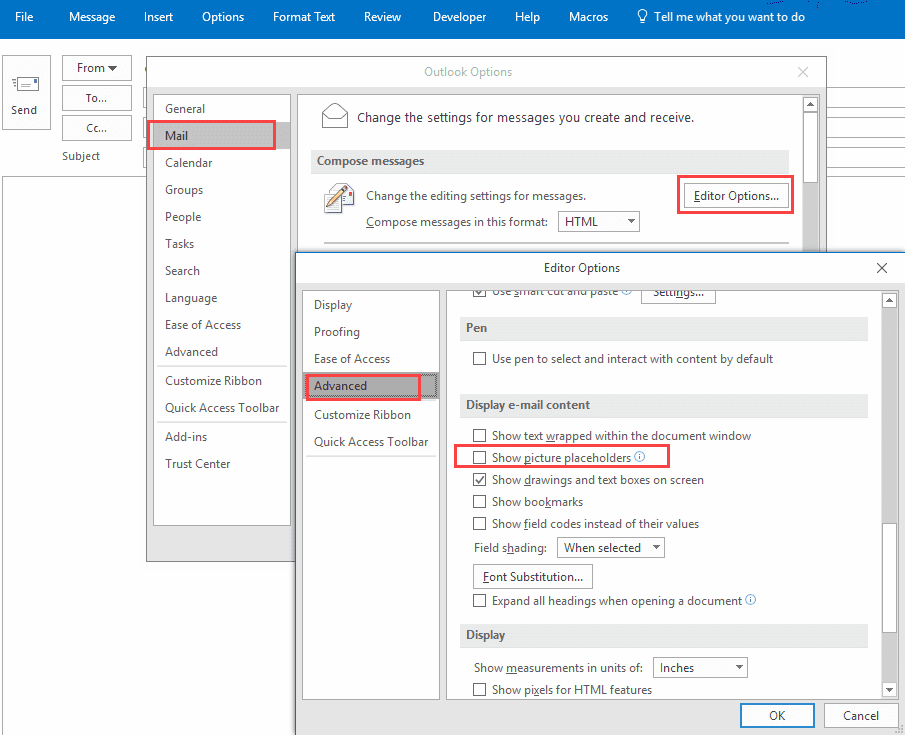 Note : The “Show picture placeholders” option was available only in older Outlook versions (2010 / 2013).