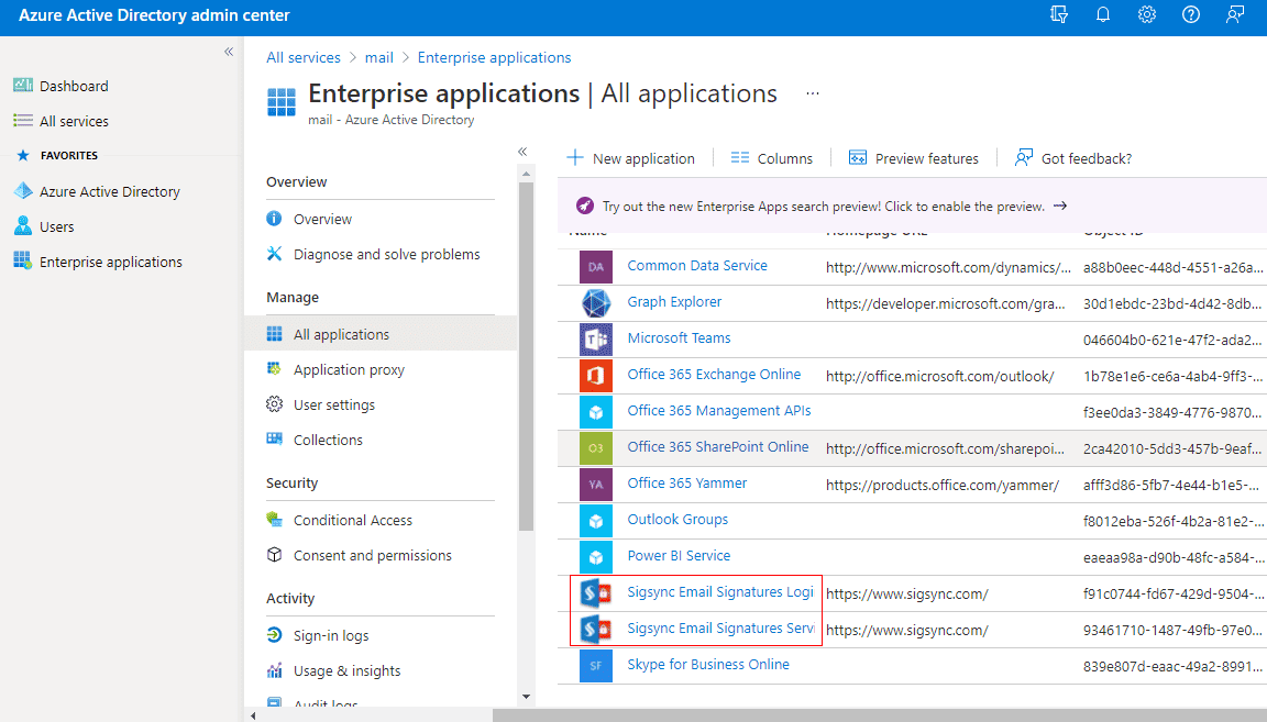 You would like to get the information about the Sigsync installations in Microsoft 365 and Azure Active Directory Admin center.