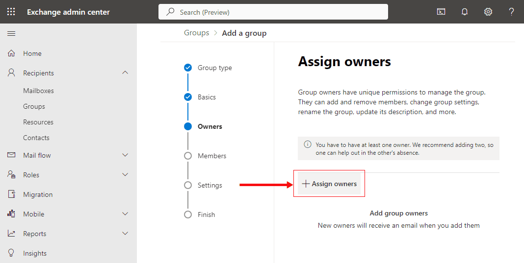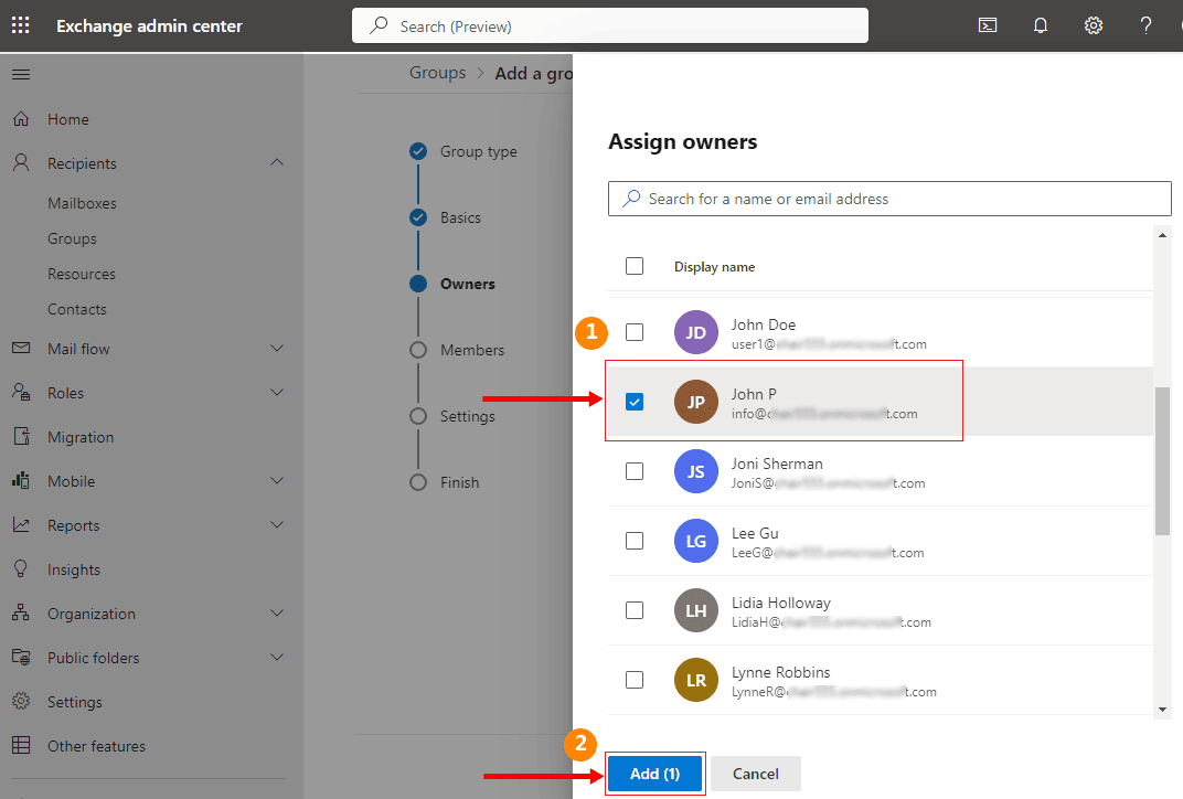 - Select the email address(es) to assign as owner(s) and click the 'Add' button