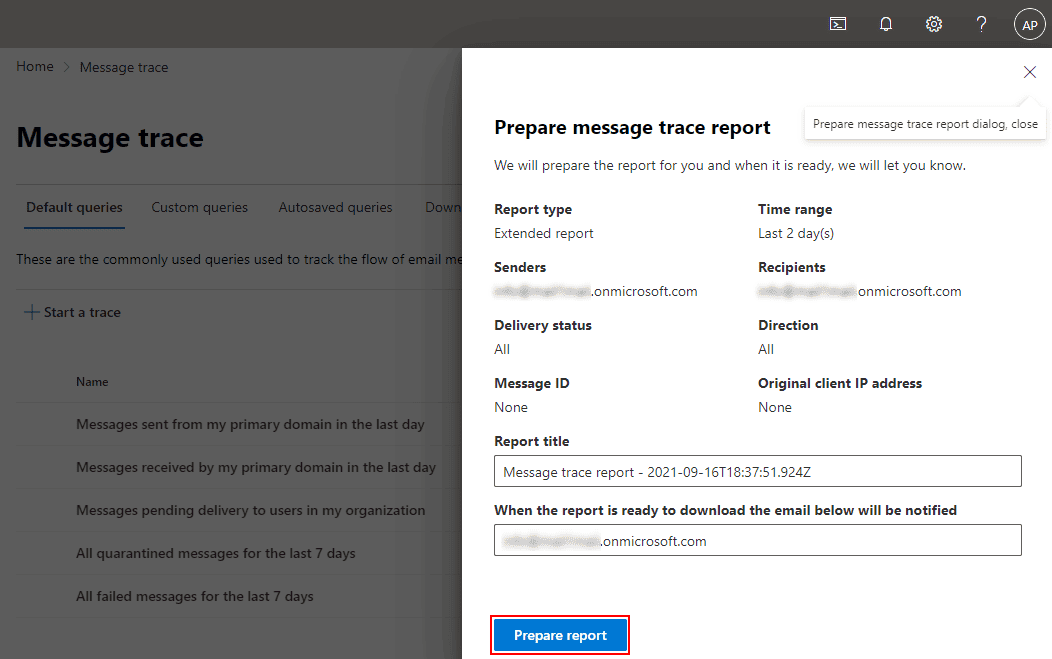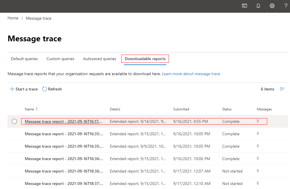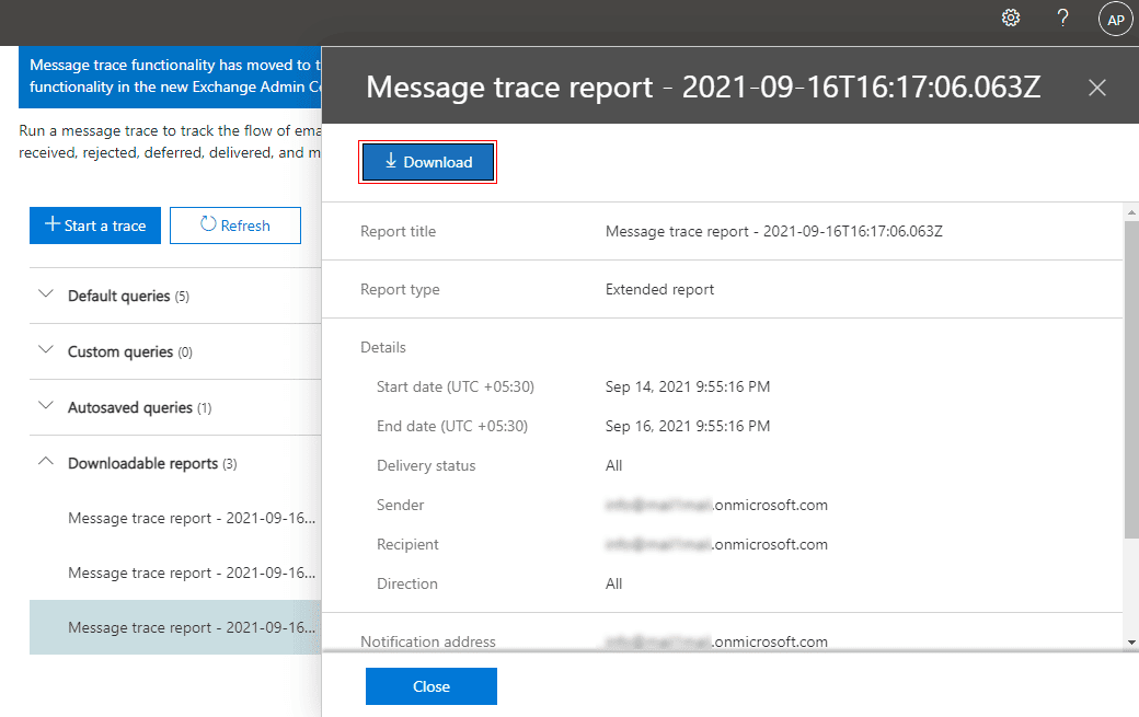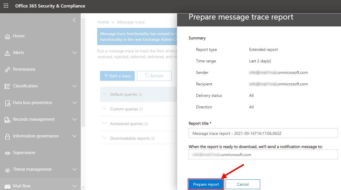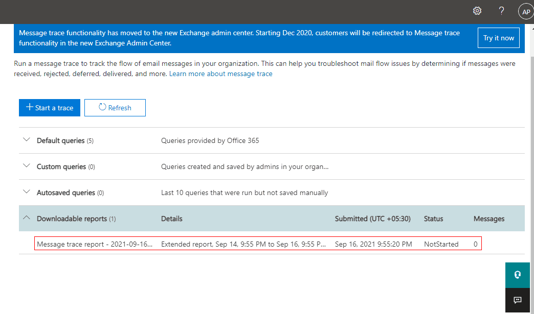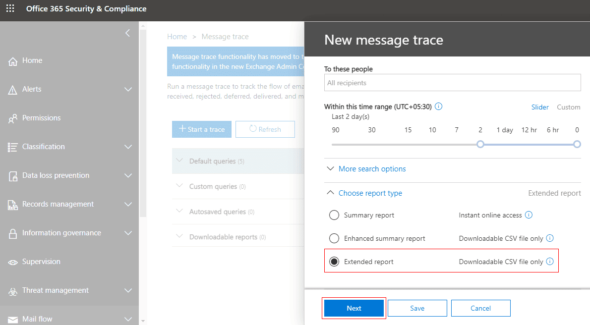 - Browse https://protection.office.com/messagetrace