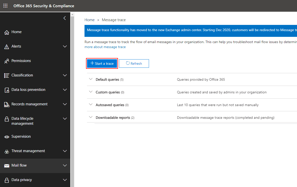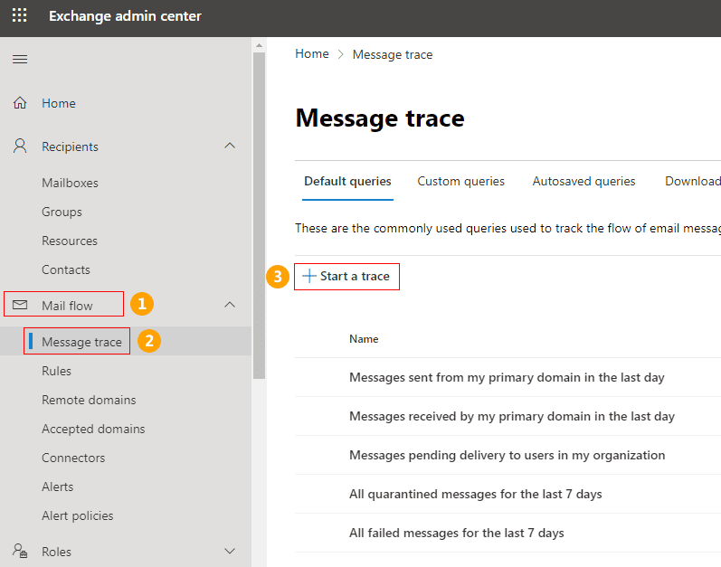 - Choose 'Mail flow' from the left panel and select 'Message trace'. Click the 'Start a trace' button as shown below
