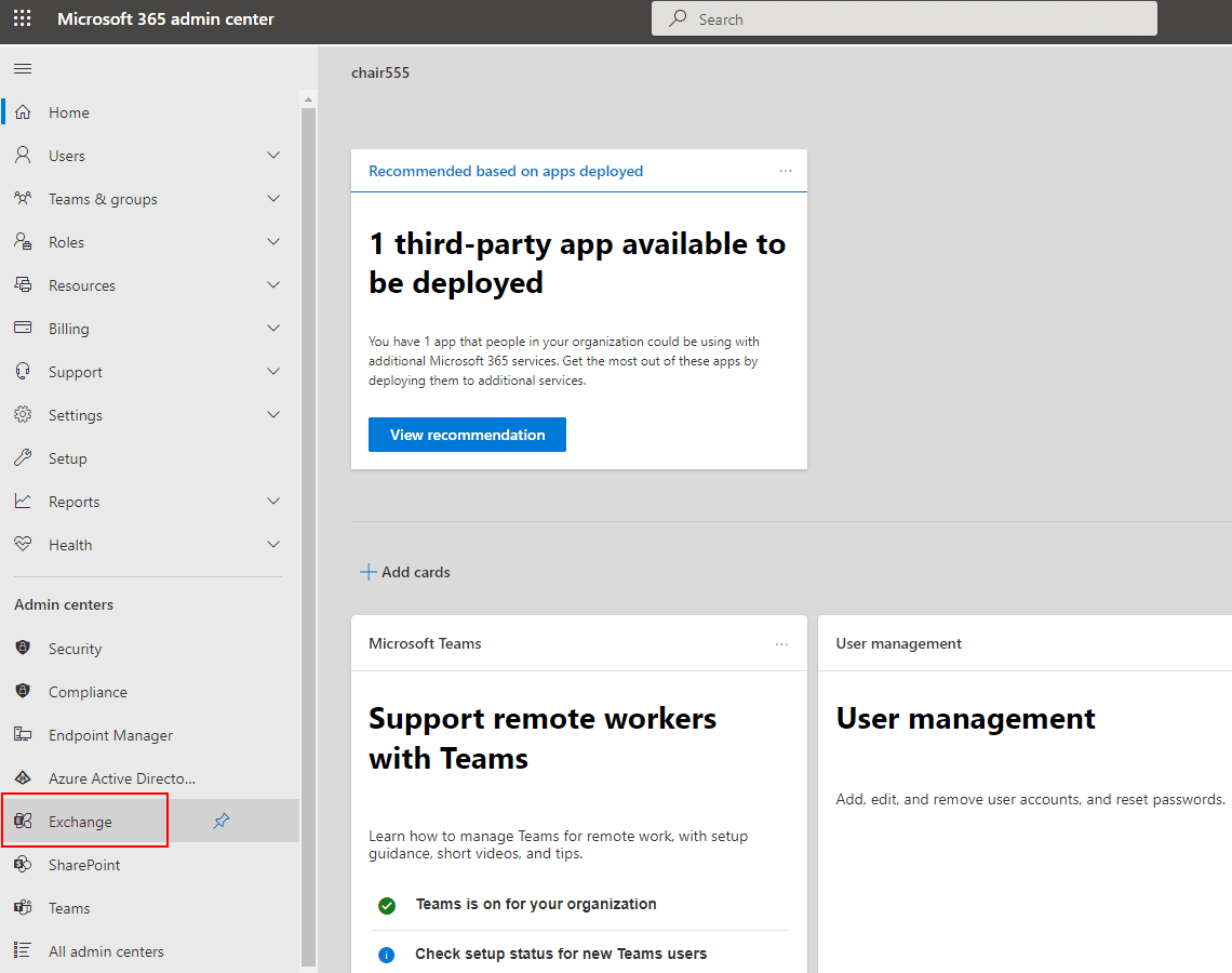- Sign in to Microsoft 365 admin center and select 'Exchange' under 'Admin centers' in the left side panel