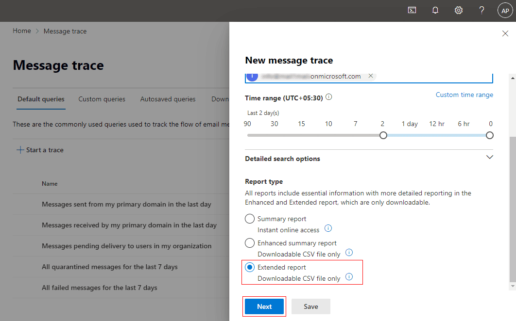 You are looking for a way to create an extended message trace report in a CSV file.
