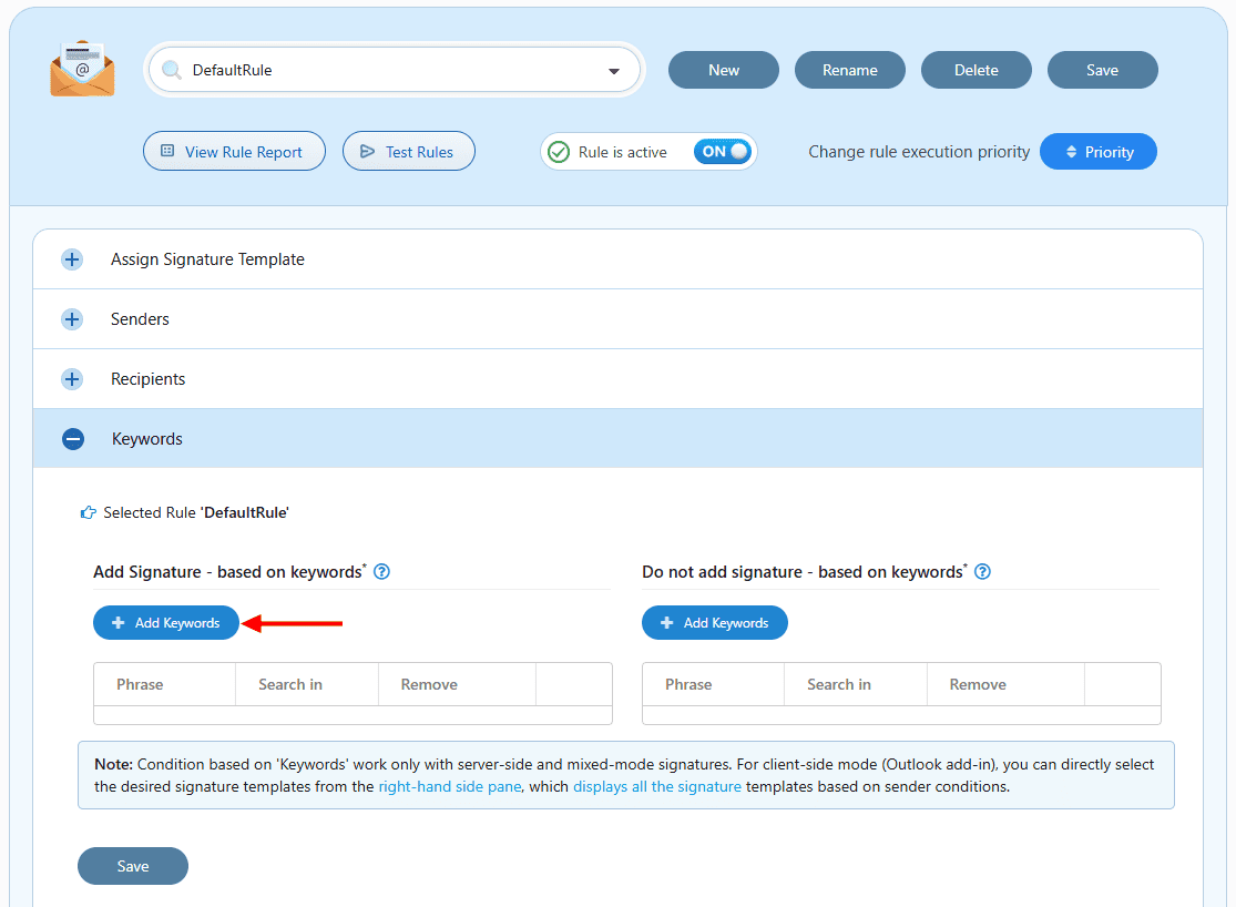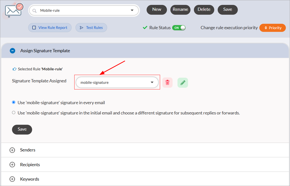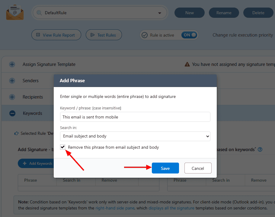 To automatically detect the identifier phrase added to your email by your mobile client and replace it with a mobile-specific Sigsync signature, you can set up signature rules in Sigsync using the steps below.