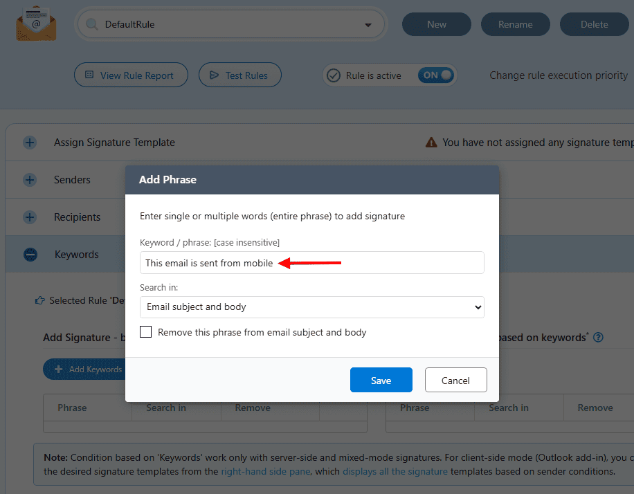 - Set the text of your mobile default signature as a keyword. For example, you could use the text 'This email is sent from my mobile device' as shown below: