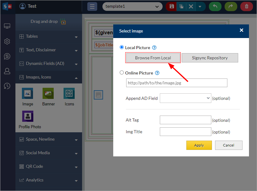 - You can either load required images from your local drive, online URL or Sigsync repository.