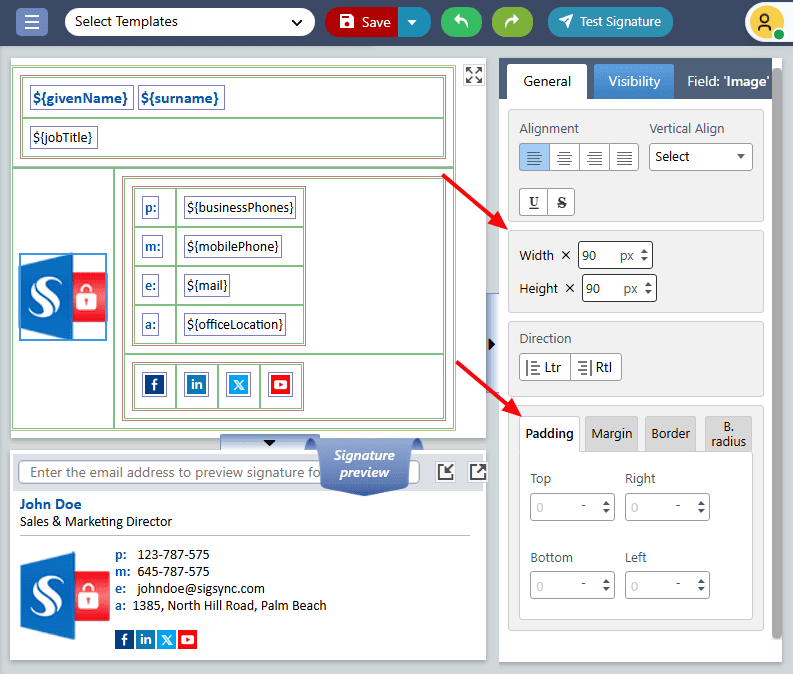 - Select the image, then adjust its ‘Height, Width, and Padding’ from the 'General' tab on the right side of the editor.