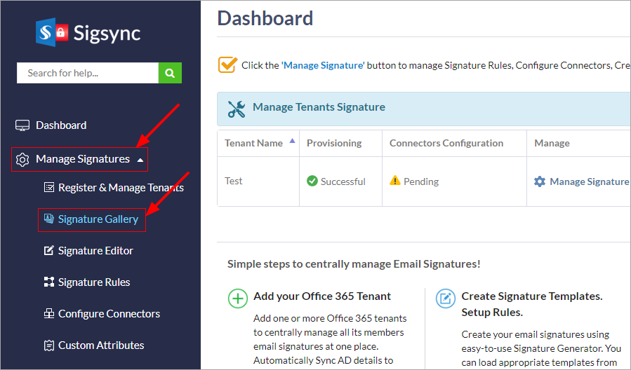 - Select the 'Manage Signatures' < 'Signature Gallery' tab