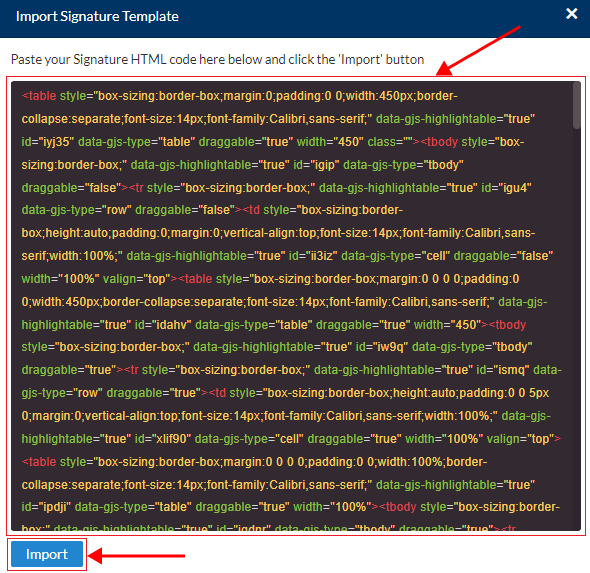 Paste the HTML code of the signature template and click the ‘Import’ button