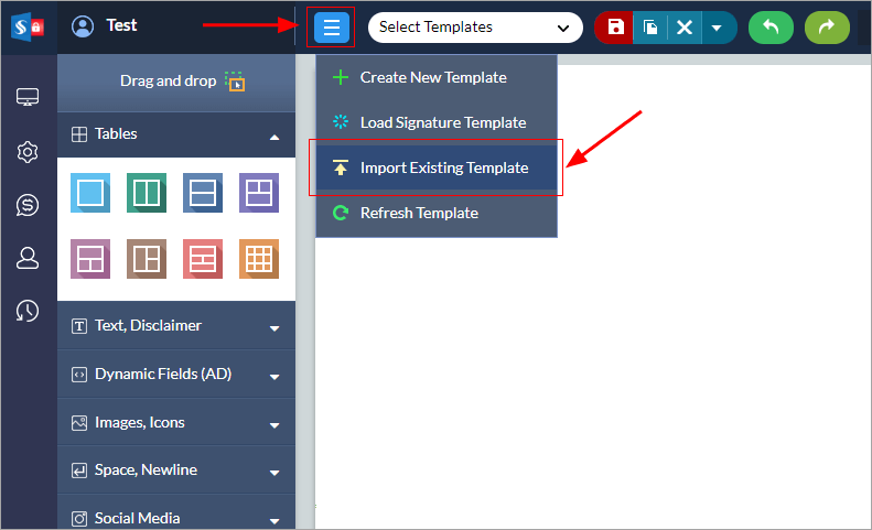 Click the ‘Menu’ icon and select the ‘Import Your Existing Template’ as highlighted in the below screenshot