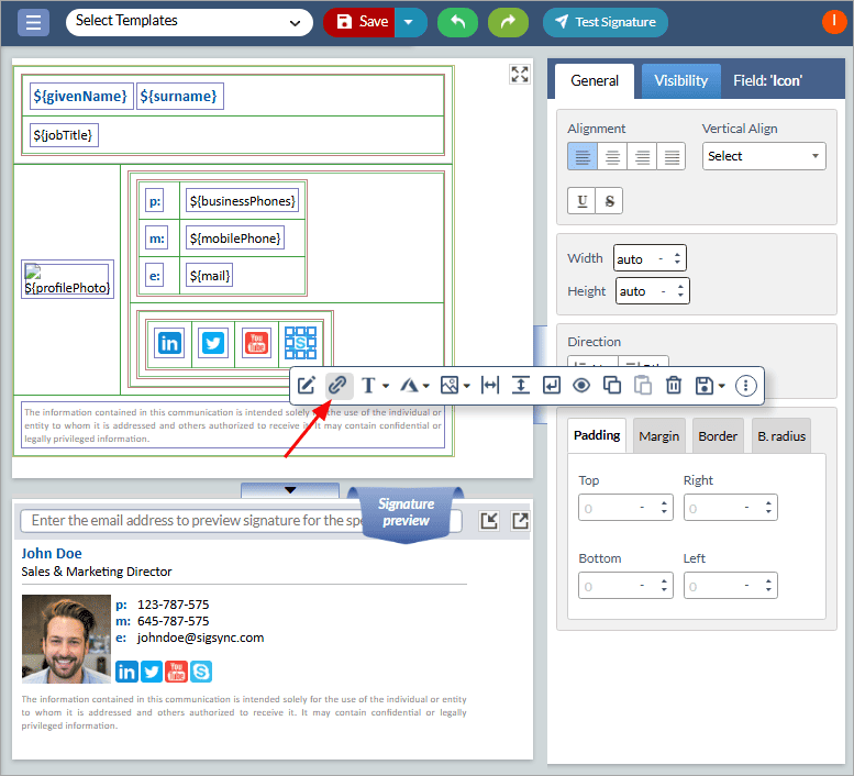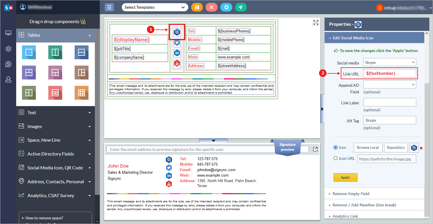 - Create a new template or open your existing signature template and drag and drop Social media component.