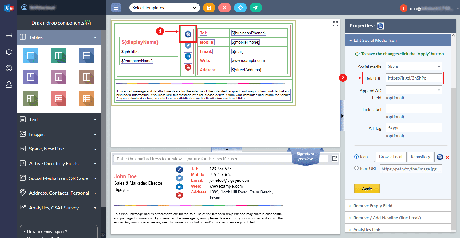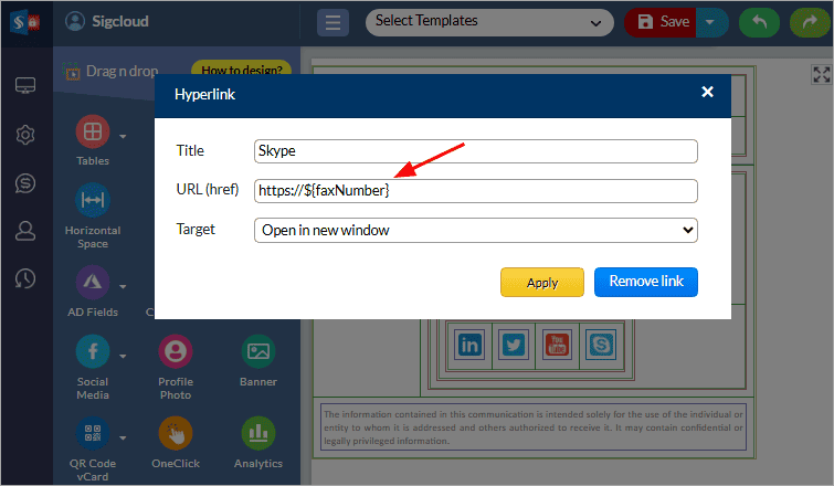 - Now, click the Skype icon in your Signature temple design area and from the right hand side Properties tab, enter the Skype short URL link generated above. Refer to the below screenshot.