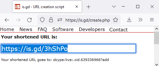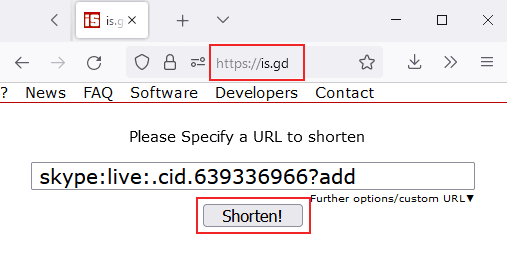 If you want, your recipients to 'add' your Skype profile then the link command is: - Click the 'Shorten' button to generate the short URL link