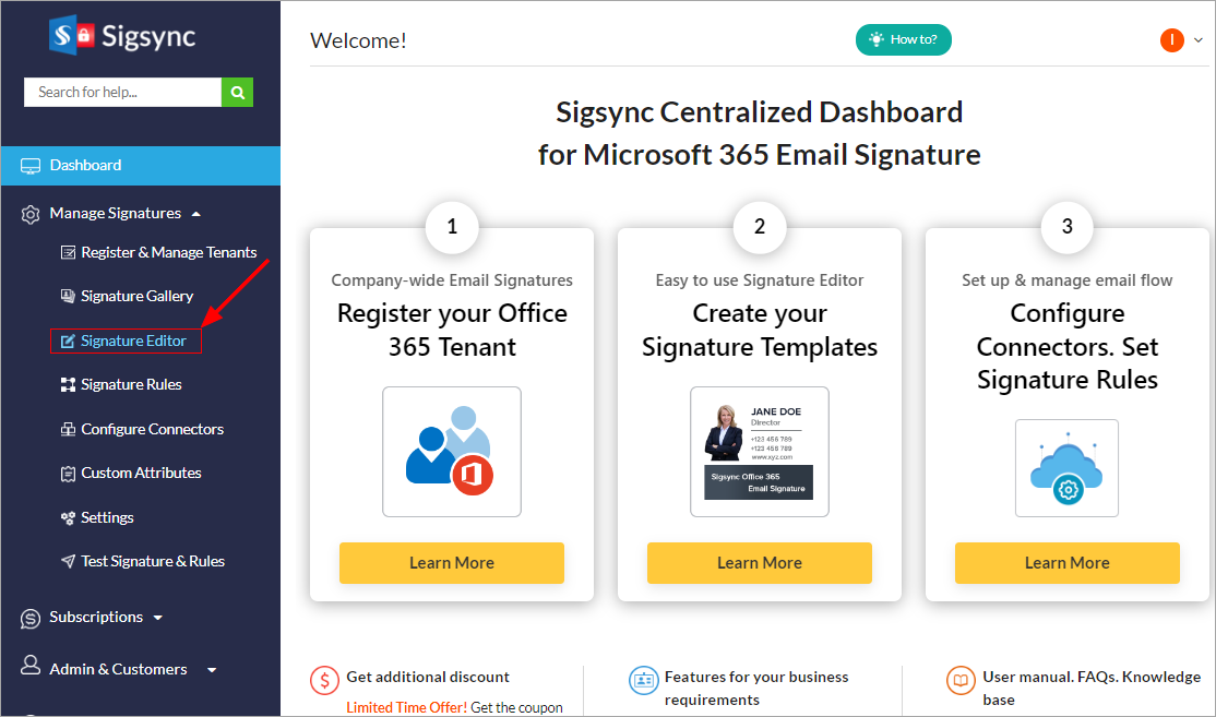 - Open Sigsync Signature Editor from the Dashboard