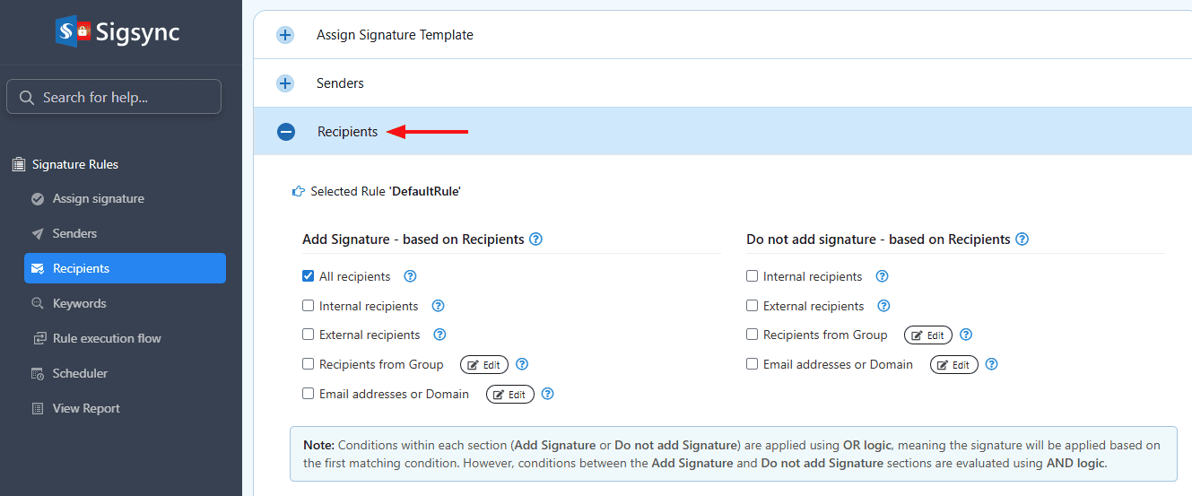 - Under 'Signature Rules', navigate to the 'Recipients' tab where you can add email addresses under 'Add Signature - based on Recipients' section.