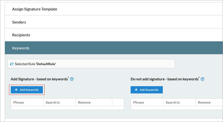 - Click the 'Add Keywords' button under 'Add signature - based on keywords' as shown.