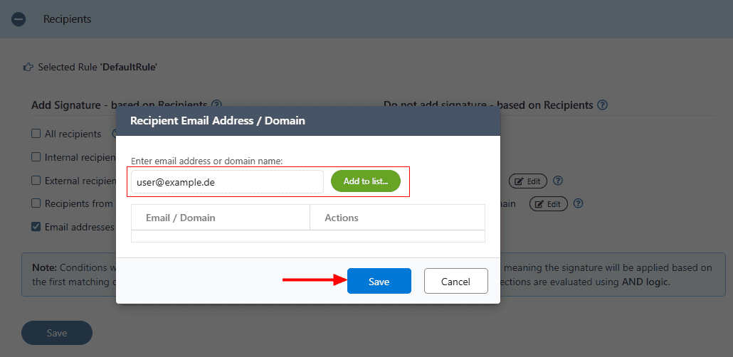 - Enter the email address or domain name so that signature will be appended to that recipient. Click on the 'Save' button to apply the changes.