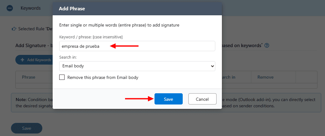 In server-side mode, Sigsync Email Signatures for Office 365 automatically adds signatures depending on rules you provide in the 'Signature rules' section. However, you can set certain keywords or phrases in your email or in the email subject. Enter those keywords / phrases in the Rule settings and set the signature. This will add the particular signature to the mails based on the keyword you included in the mail.